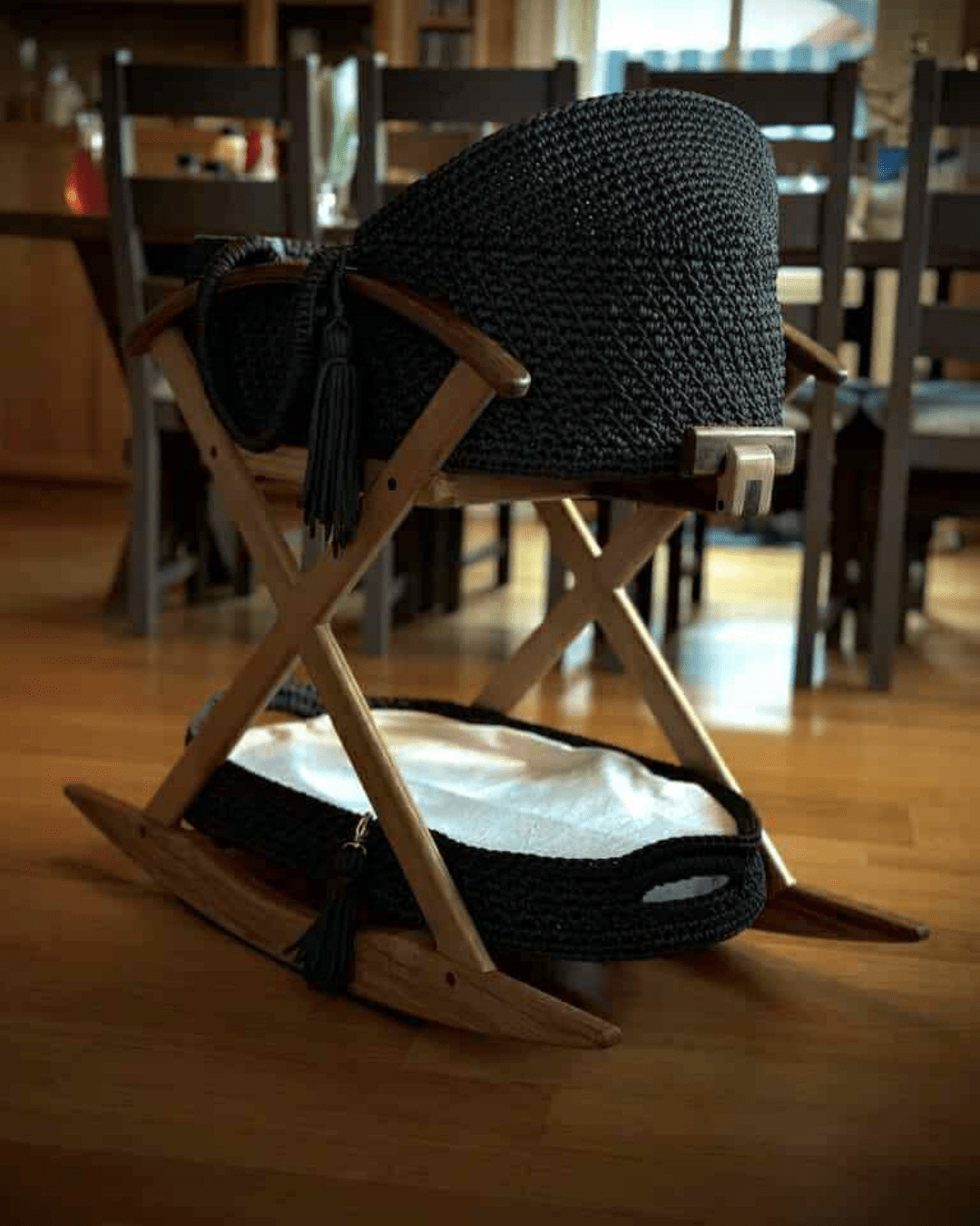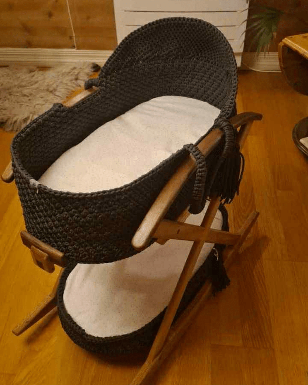 Eksempel på håndheklet vugge ( se bilder) Til denne er det brukt tre nøster av 6 mm hekletråd.